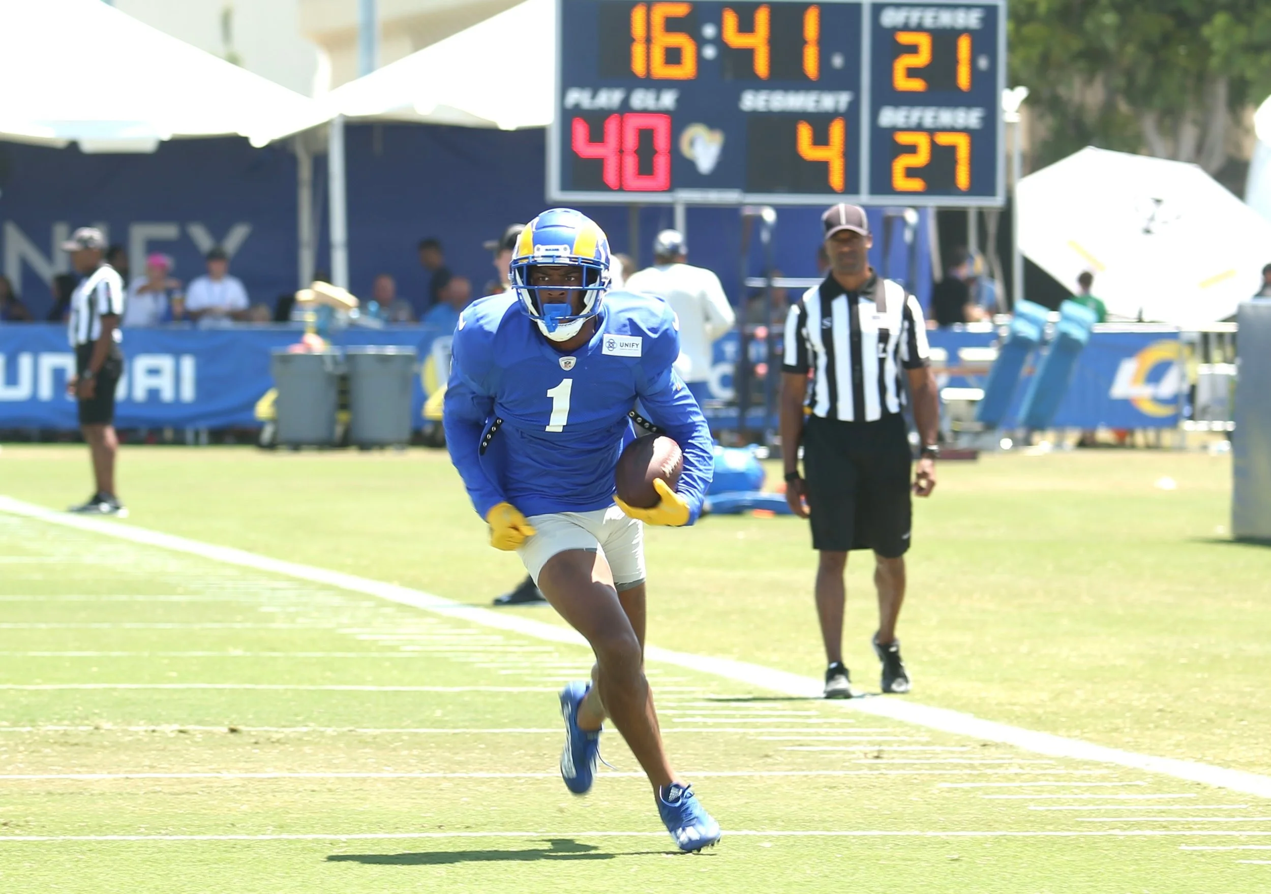 Los Angeles Rams #1 Allen Robinson II (WR) running back to the huddle after making a catch during training camp. Photo by Daynesha Lewis/TGSportstv1.