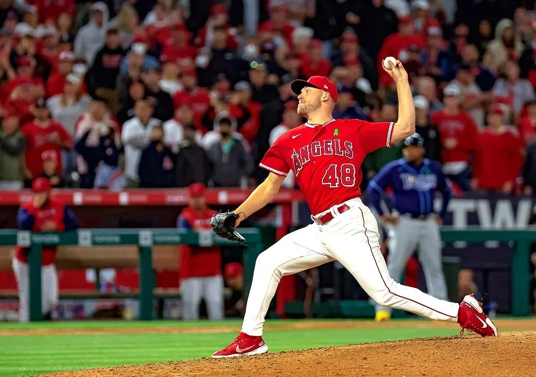 Los Angeles Angels #48 Reid Detmers (LHP) pitched a no-hitter against the Tampa Bay Rays at Angels Stadium. Photo by Jerry Kelly/TGSportstv1.