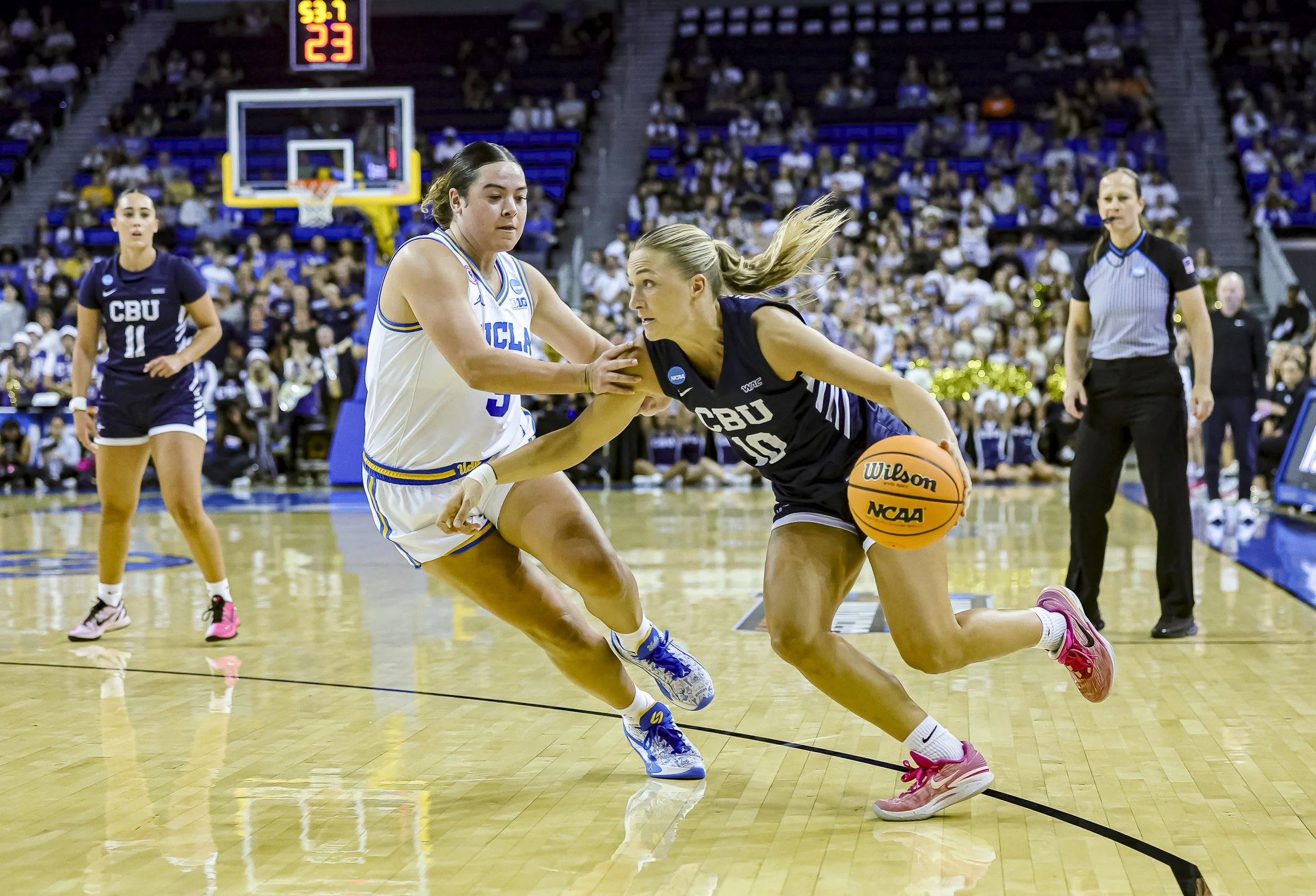 California Baptist Lancers #10 Chance Bucher (G) is driving toward the basket while being defended by the UCLA Bruins #5 Charlisse Leger-Walker at Pauley Pavilion in the first round of the NCAA Tournament. Photo by Jerry Kelly/TGSportstv1 March 21, 2026.