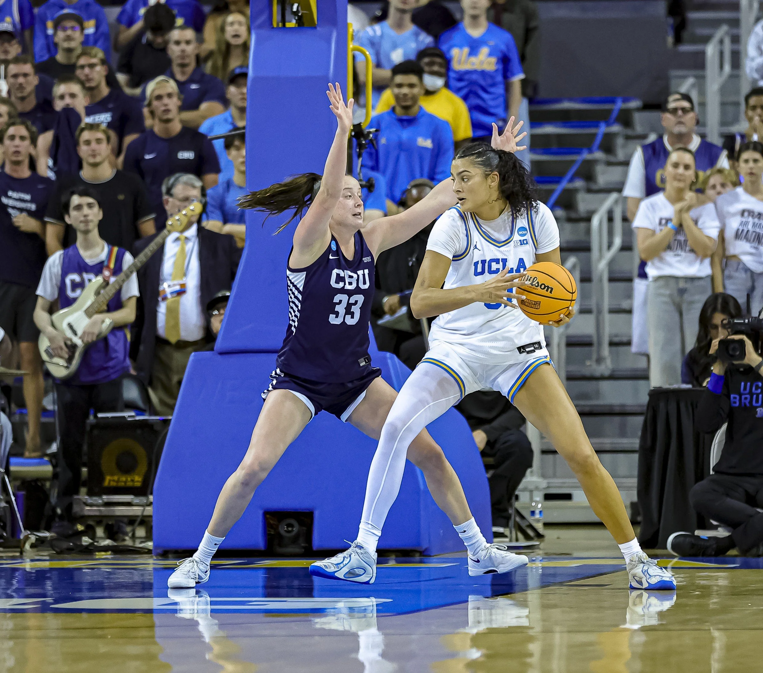 UCLA Bruins #51 Lauren Betts (C) is posting up in the paint while being guarded by California Baptist Lancers #33 Grace Schmidt (F) at Pauley Pavilion in the first round of the NCAA Tournament. Photo by Jerry Kelly/TGSportstv1 March 21, 2026.