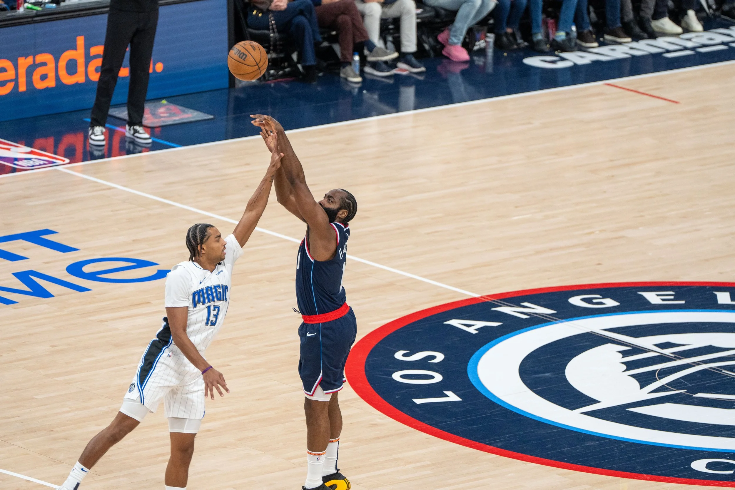 Los Angeles Clippers #1 James Harden (G) is being fouled on his three-point shot by the Orlando Magic’ #13 Jett Howard (G). Photo by Omer khan/TGSportstv1