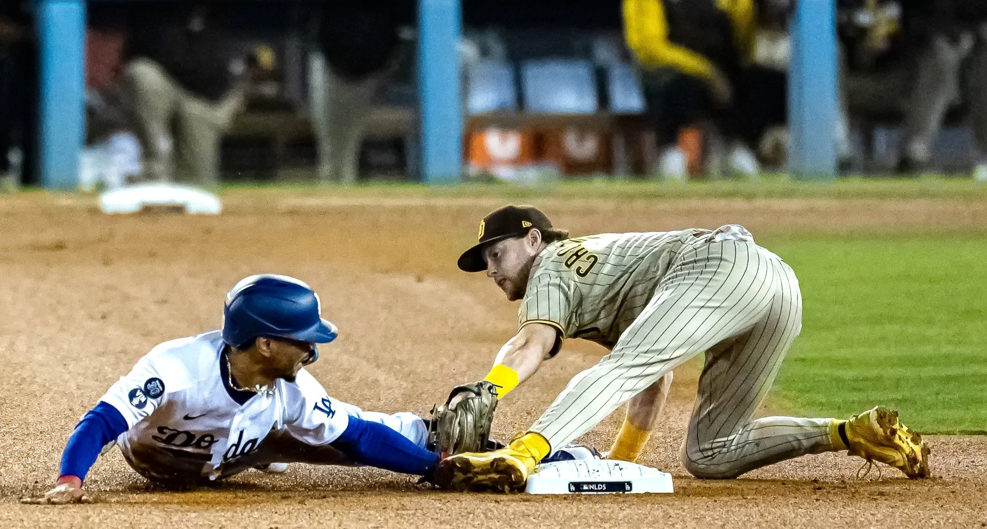 Los Angeles Dodgers #50 Mookie Betts is tagged out by the San Diego Padres #9 Jake Cronenworth trying to steal second base in Game 2 of the NLDS. Photo by Jerry Kelly/TGSportstv1.
