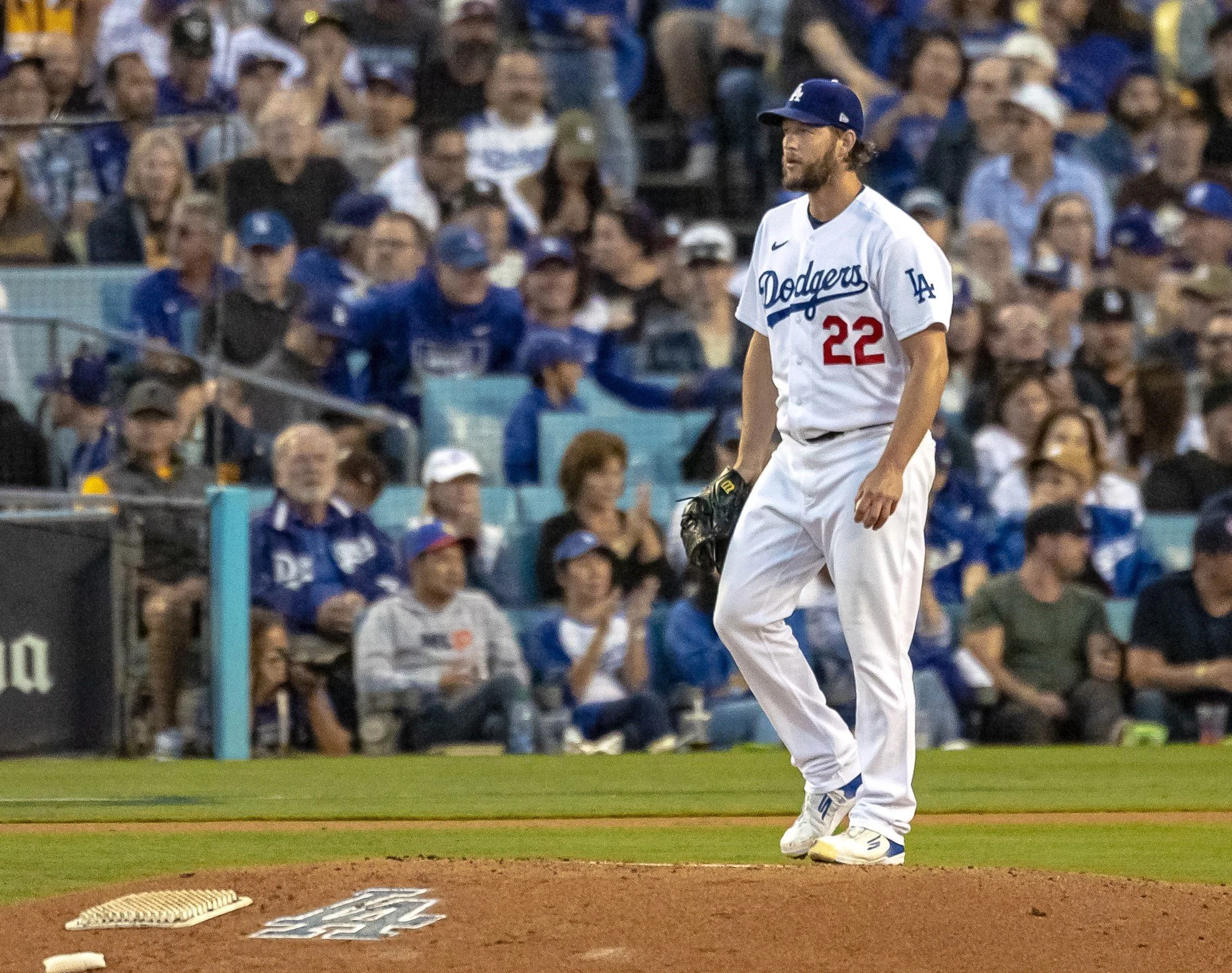 Los Angeles Dodgers #22 Clayton Kershaw (LHP) gave up three runs against the San Diego Padres in Game 2 of the NLDS. Photo by Jerry Kelly/TGSportstv1.