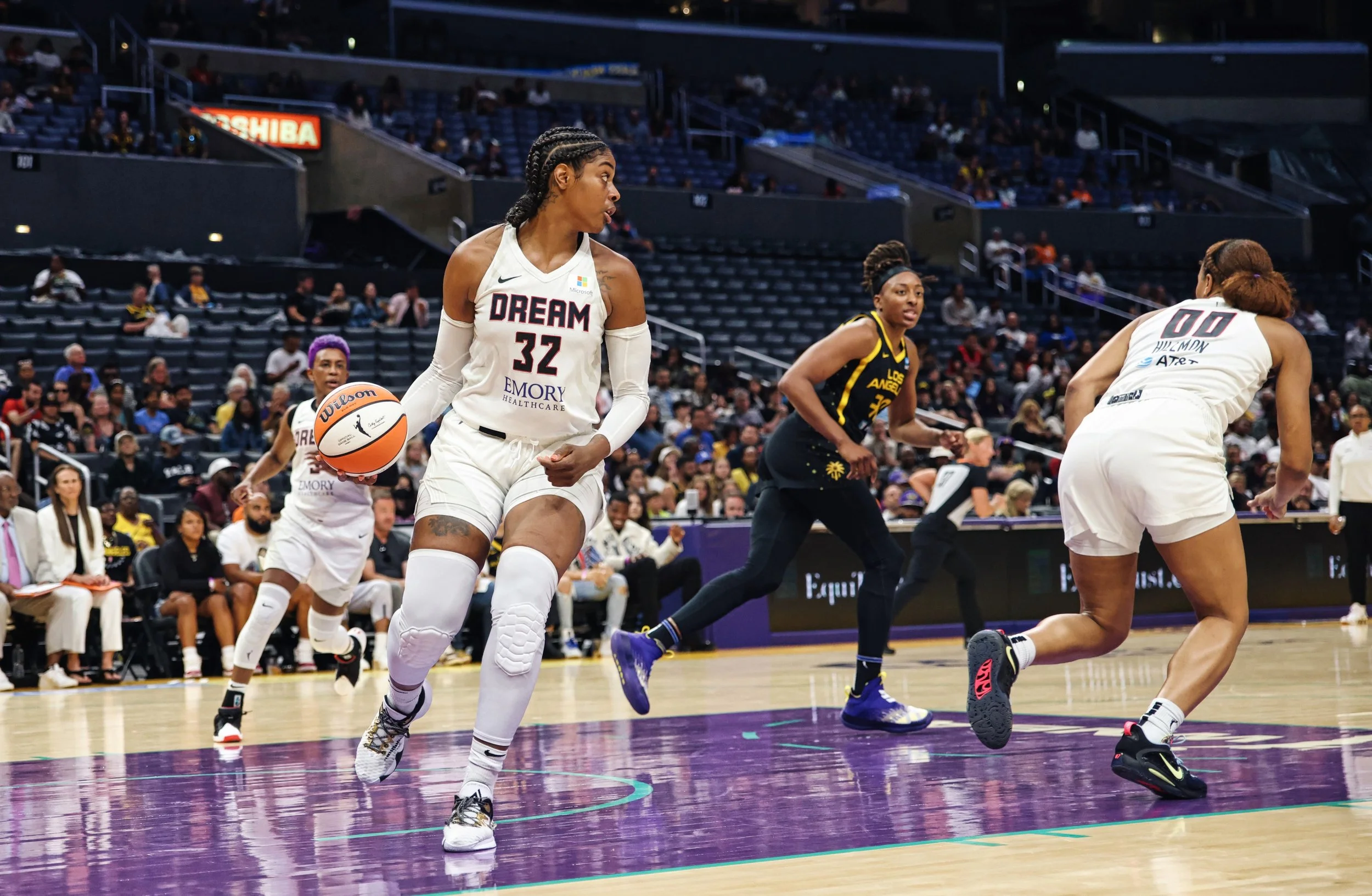 Atlanta Dream #32 Cheyenne Parker (C) grabbing a rebound to help start a fast break. Photo by Skylar Blackmon/TGSportstv1.
