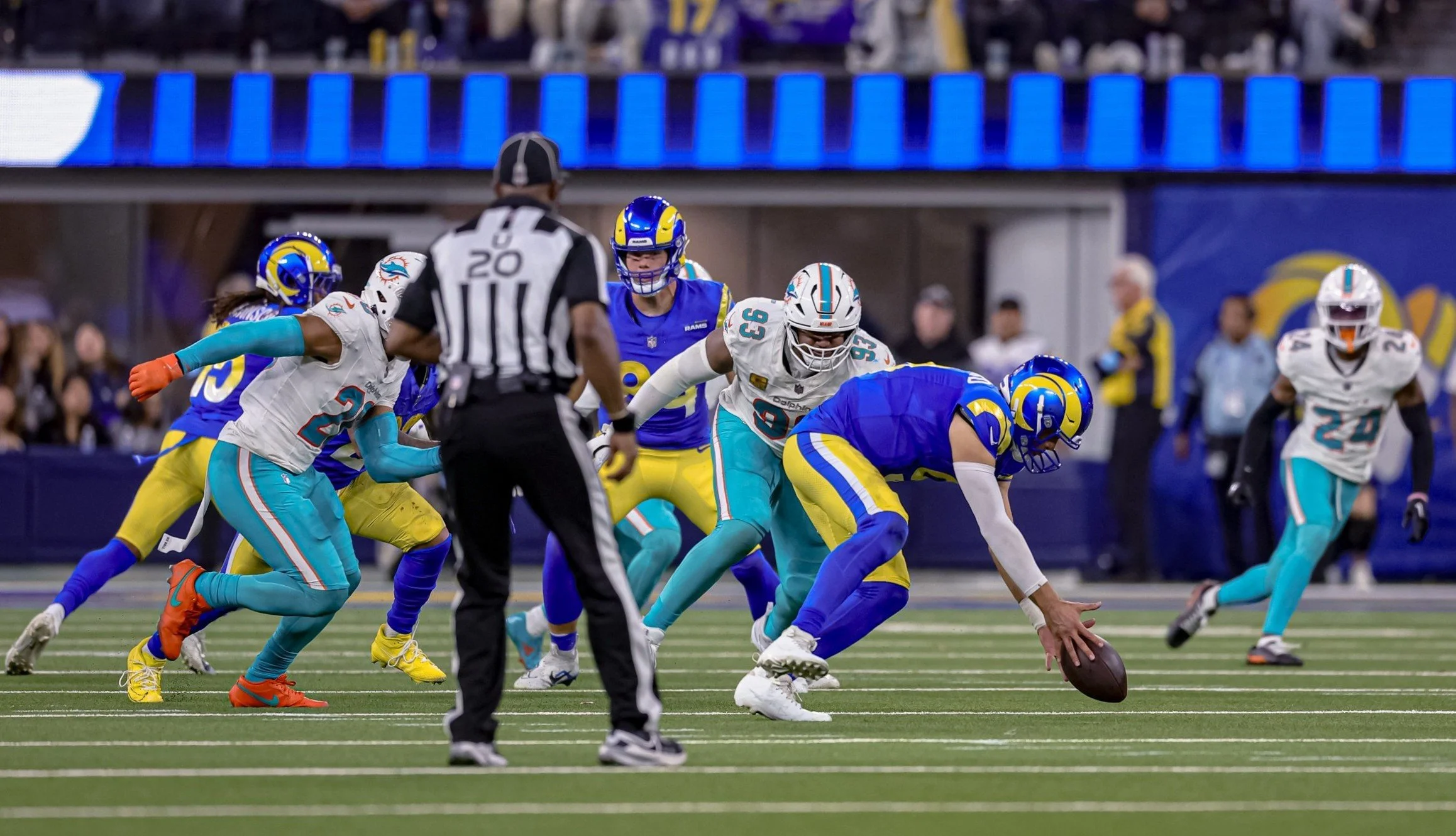 INGLEWOOD, CA - The Miami Dolphins (3-6) on Monday Night Football pressured Matthew Stafford, sacked four times, two fumbles, and one interception, and the Los Angeles Rams (4-5) got beaten 23-15.