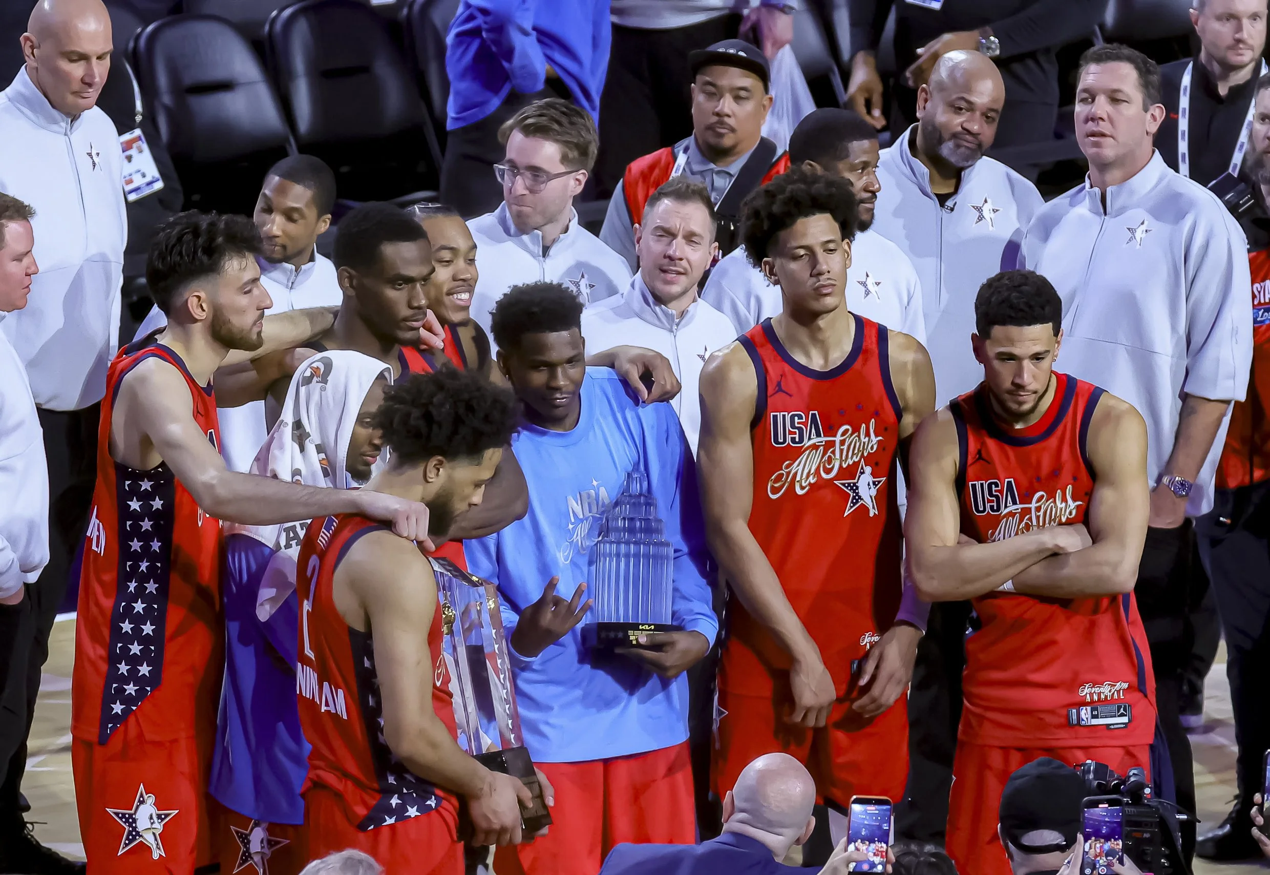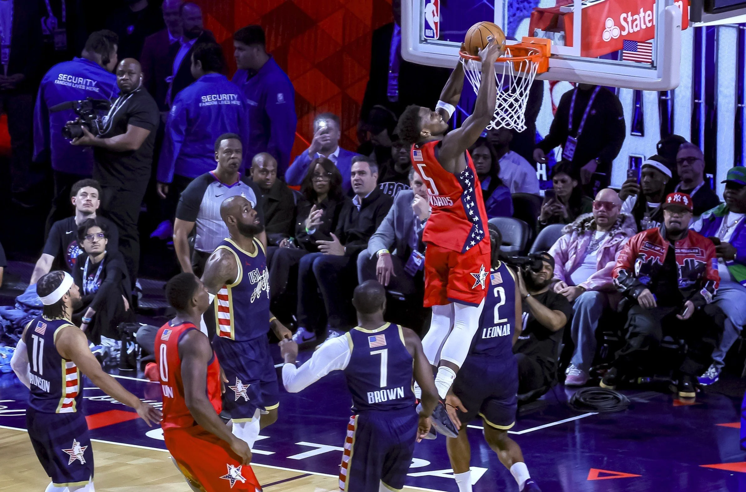 INGLEWOOD, CA - The USA Stars, with their younger roster, Tyrese Maxey (G) with 9 points, and Anthony Edwards (G) and Chet Holmgren (C) both had 8 points, jumped out early and never looked back as they dominated the USA Stripes 47-21 in the NBA All-Star Championship Title Game at the Intuit Dome.