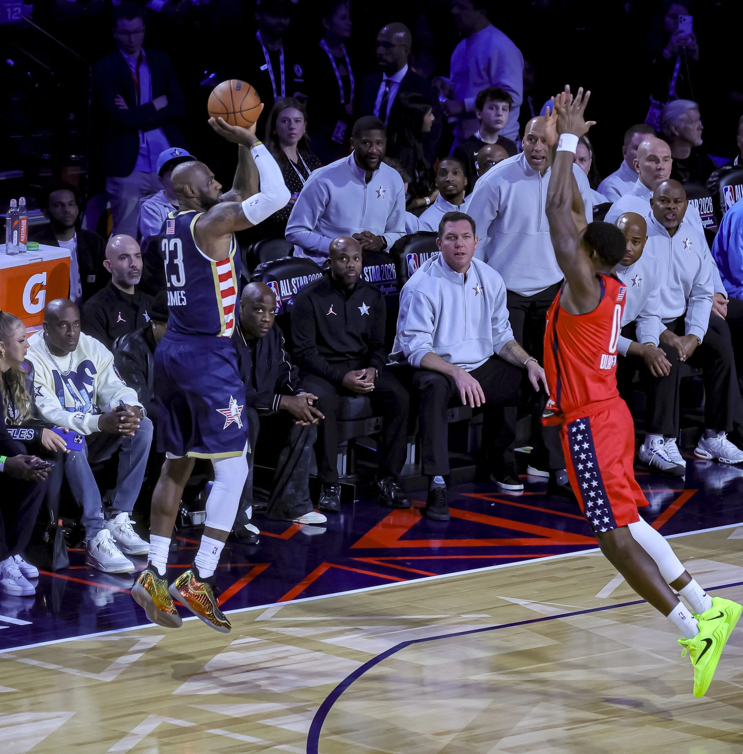 The USA Stripes #23 LeBron James (F) three-point shot from the left side of the court in the 2026 NBA All-Star Championship Game against the USA Stars at the Intuit Dome. Photo by Jerry Kelly/TGSportstv1 February 15, 2026.