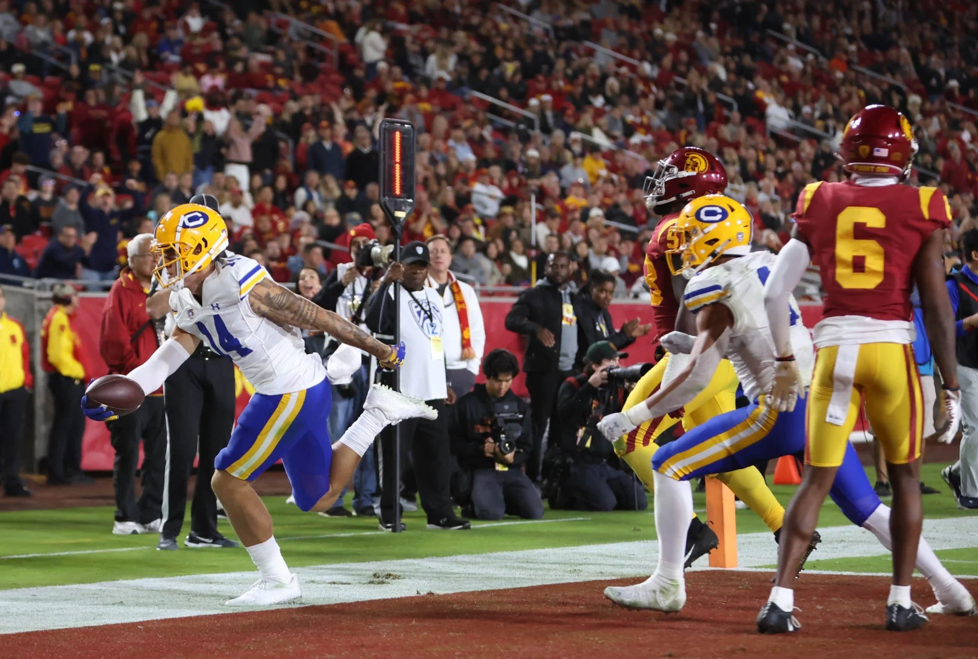 California Golden Bears #6 Jaydn Ott 10-yard touchdown against the USC Trojans’ defense. Photo by Darwin Walker/TGSportstv1.