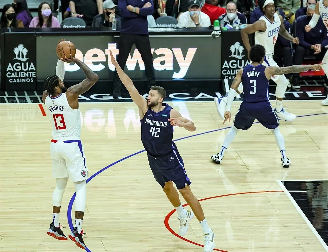 Los Angeles Clippers #13 Paul George's three-point shot being challenged by the Dallas Mavericks #42 Maxi Kleber. Photo by Jerry Kelly/T.G.Sportstv1.