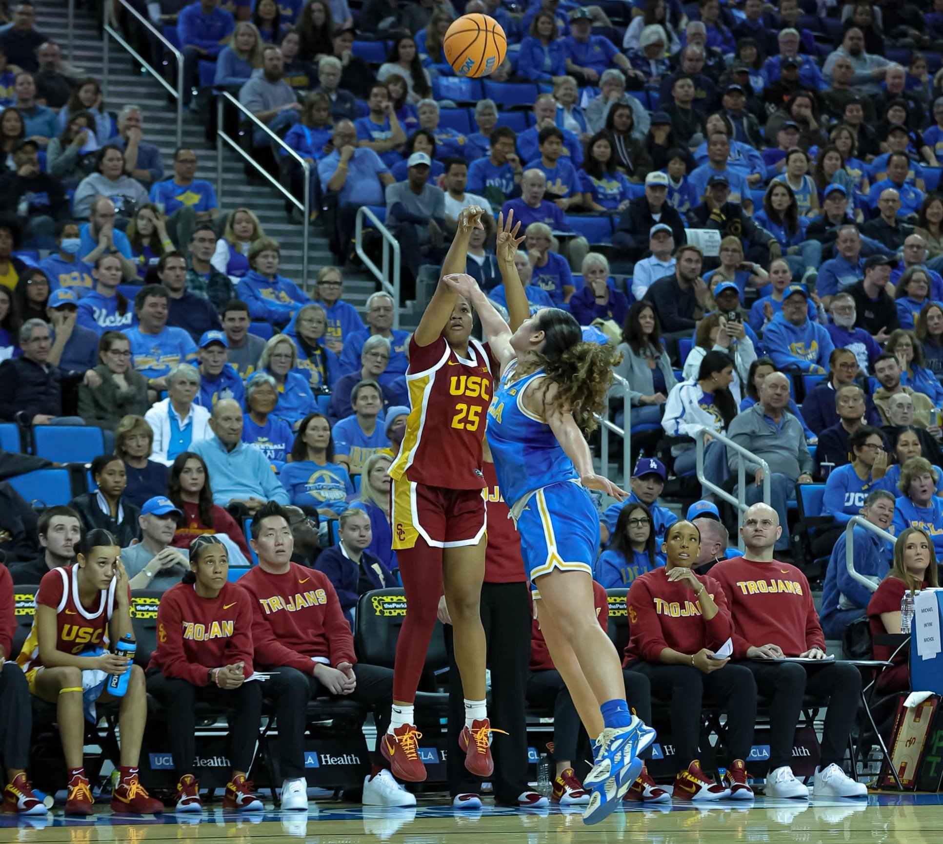 USC Trojans #25 Kara Dunn (G) going up for a three-point shot in front of her beach while a UCLA Bruins’ defender is challenging the attempt at Pauley Pavilion. Photo by Jerry Kelly/TGSportstv1 January 3, 2026.