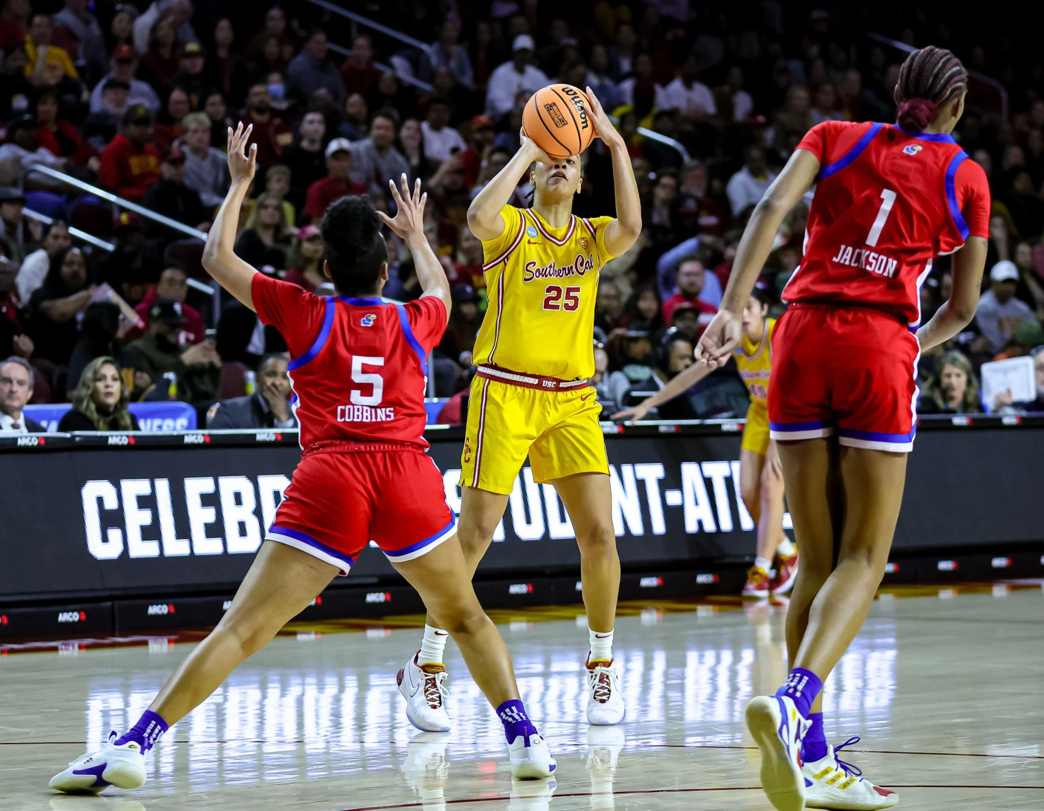 JuJu Watkins led the Trojans in scoring with 28 points, 11 rebounds, and five assists, McKenzie Forbes with 20 points, and Kayla Padilla and Rayah Marshall each had 9 points. S'Mya Nichols led the Jayhawks in scoring with 22 points, and Taiyanna Jackson with 10 points.