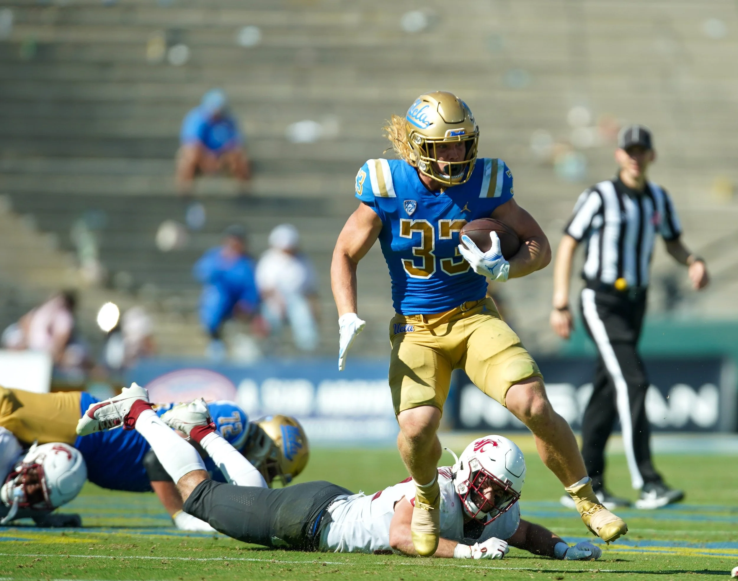 UCLA Bruins #33 Carson Steele (RB) breaking free downfield for big yardage after against the Washington State Cougars defense. Photo by Rashad Griffin/TGSportstv1.