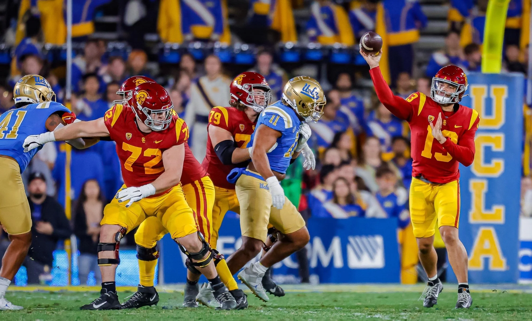 USC Trojans #13 Caleb Williams threw two touchdowns against the UCLA Bruins’ defense at the Pasadena Rose Bowl. Photo by Jerry Kelly/TGSportstv1.