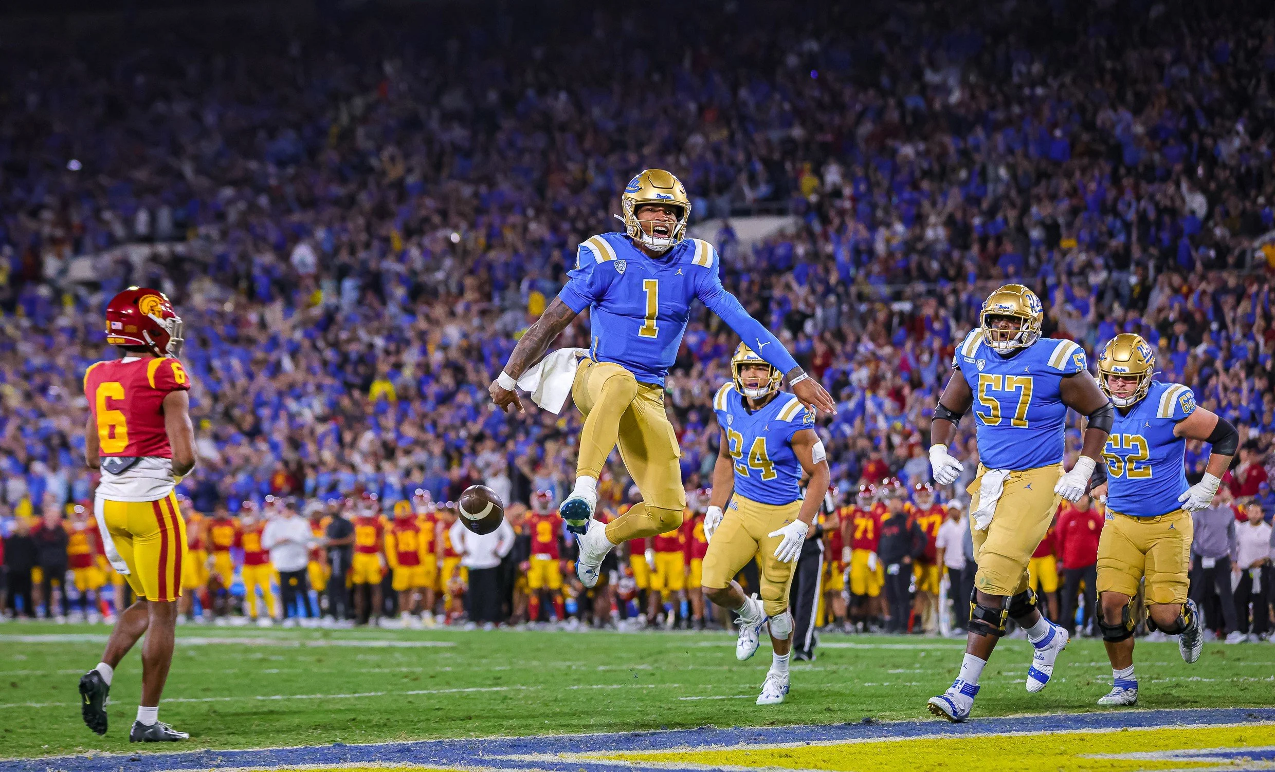 UCLA Bruins #1 Dorian Thompson-Robinson 1-yard touchdown run against the USC Trojans. Photo by Jerry Kelly/TGSportstv1.