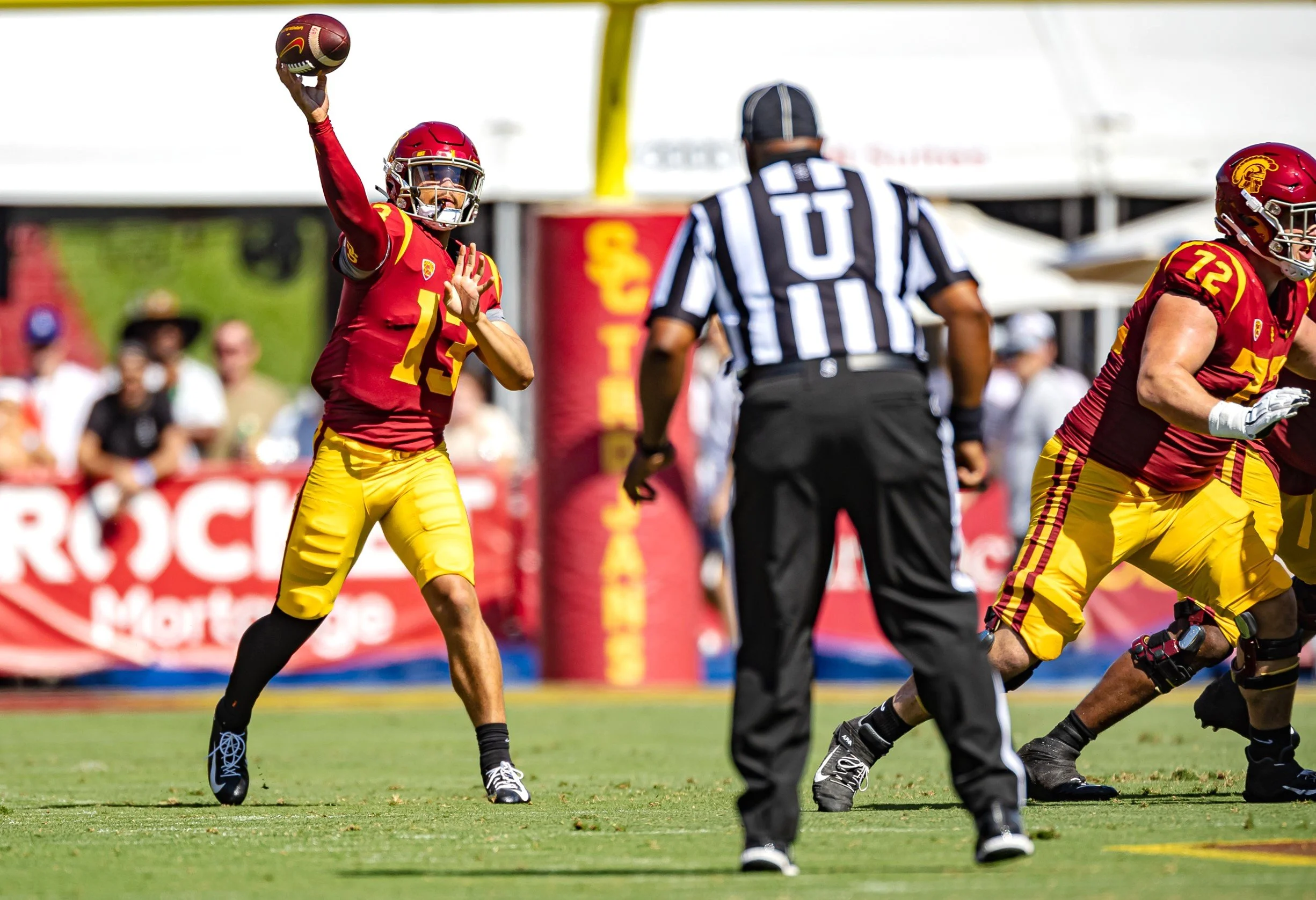 USC Trojans #13 Caleb Williams (QB) threw two touchdowns against the Rice Owls' defense at the Los Angeles Memorial Coliseum. Photo by Jerry Kelly/TGSportstv1.